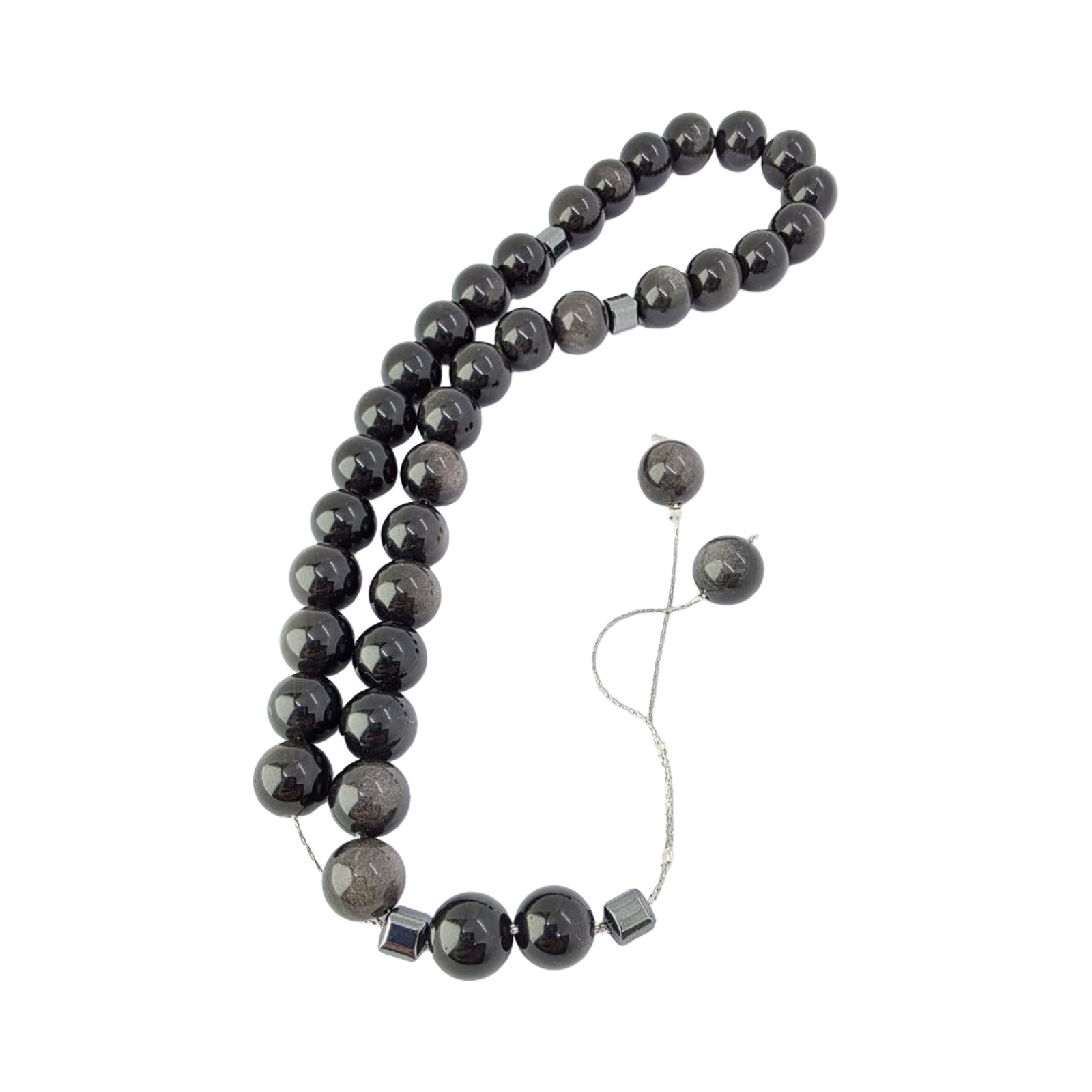 سبحة أوبسيديان أسود طبيعي (٣٣ حبة) بمقاس ١٠ مل “قصة بلية”. مطعمة بفواصل هيماتيت رمادية ومنظومة على خيط ستانلس ستيل فائق القوة. قطعة بركانية فخمة تجمع بين السواد الملكي والصلابة المطلقة.