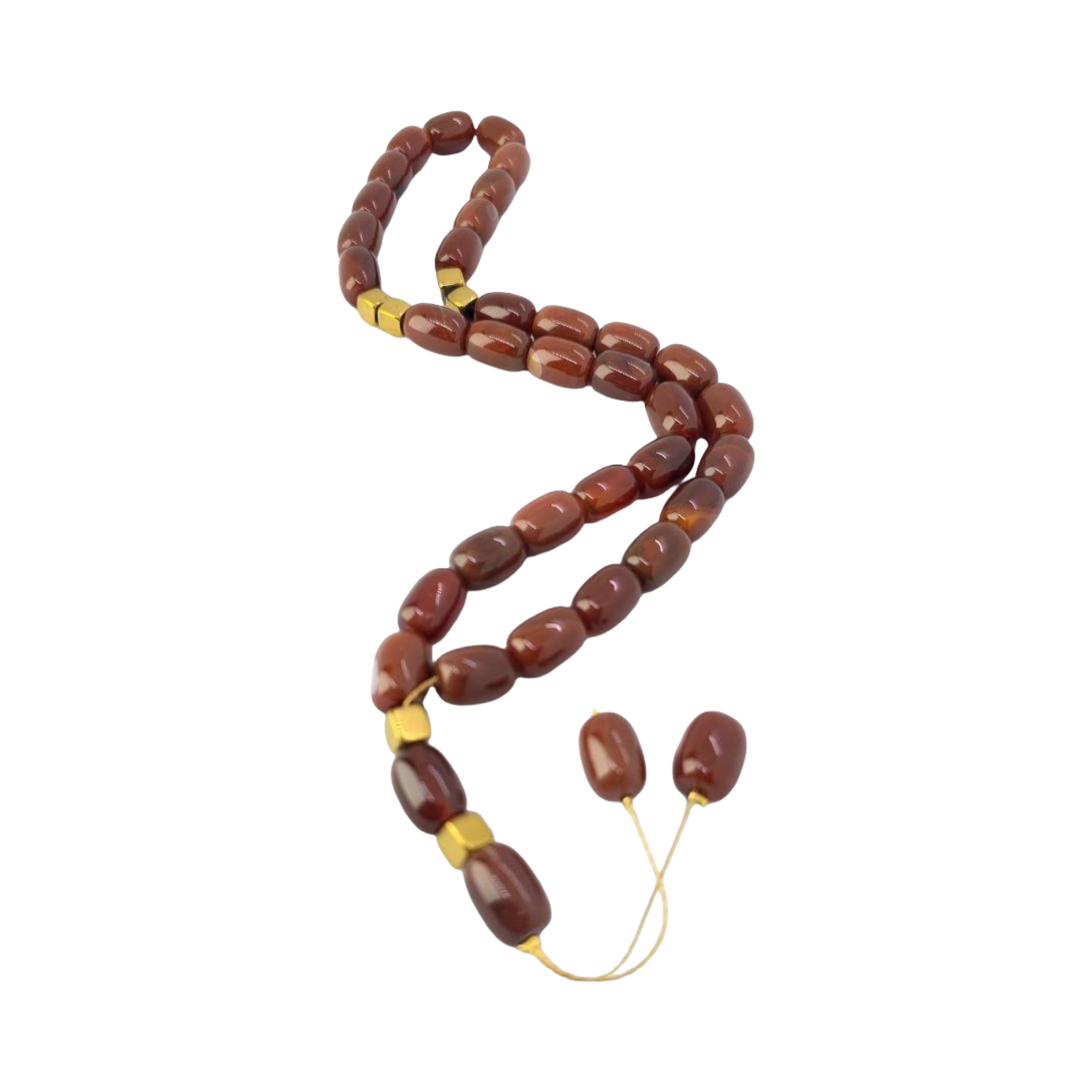 سبحة عقيق يمني كرزي طبيعي (نخب أول) بمقاس ضخم ١٤ مل “قصة براميلي”. لون أحمر كرزي شفاف وساحر، منظومة على خيط ستانلس ستيل فائق القوة. قطعة ملكية تجسد قمة الفخامة اليمانية.