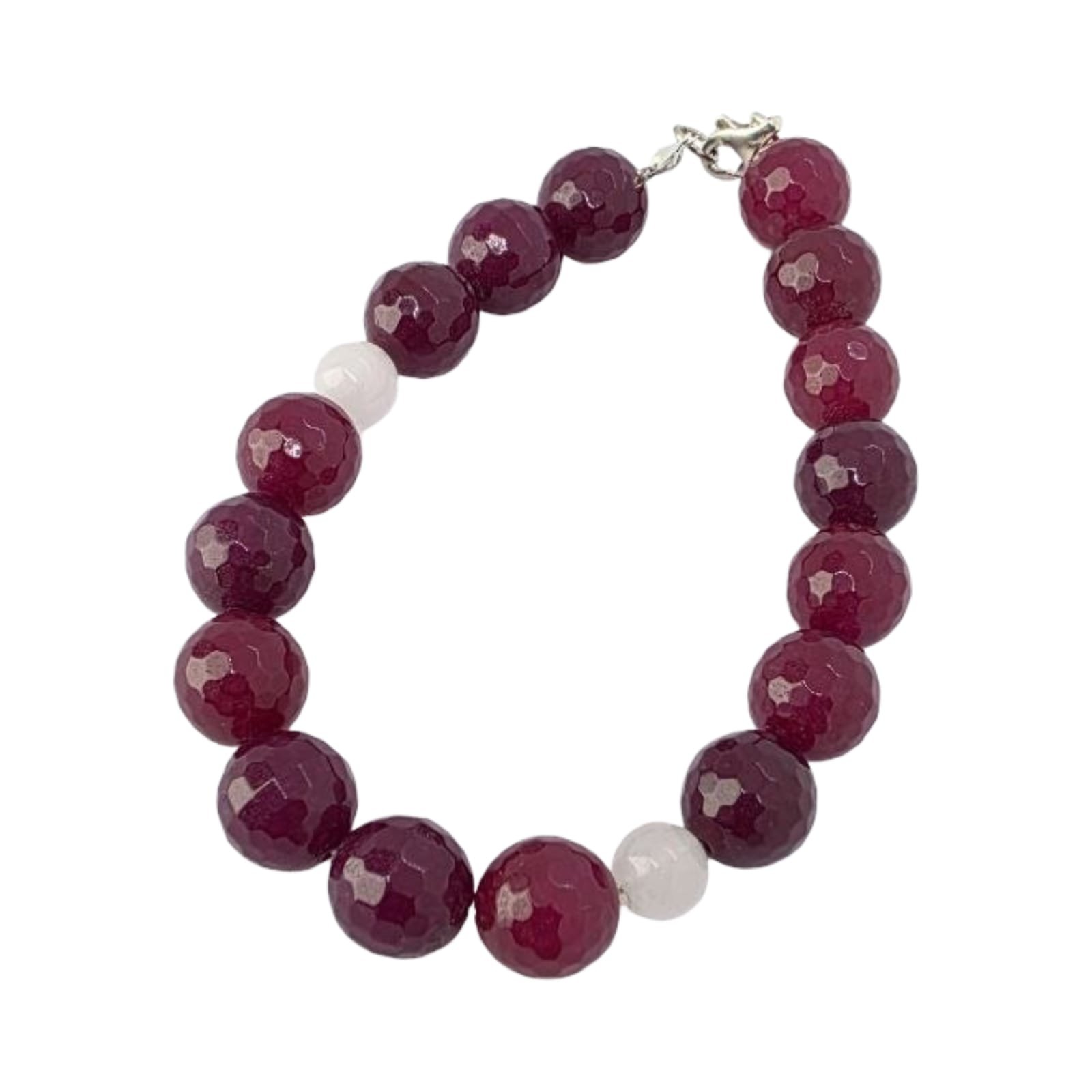 A striking faceted bracelet featuring 12mm Red Jade and 10mm Tree Rose Quartz. Designed with a high-flex elastic core and a premium Sterling Silver clasp. A unique blend of fiery boldness and botanical elegance.