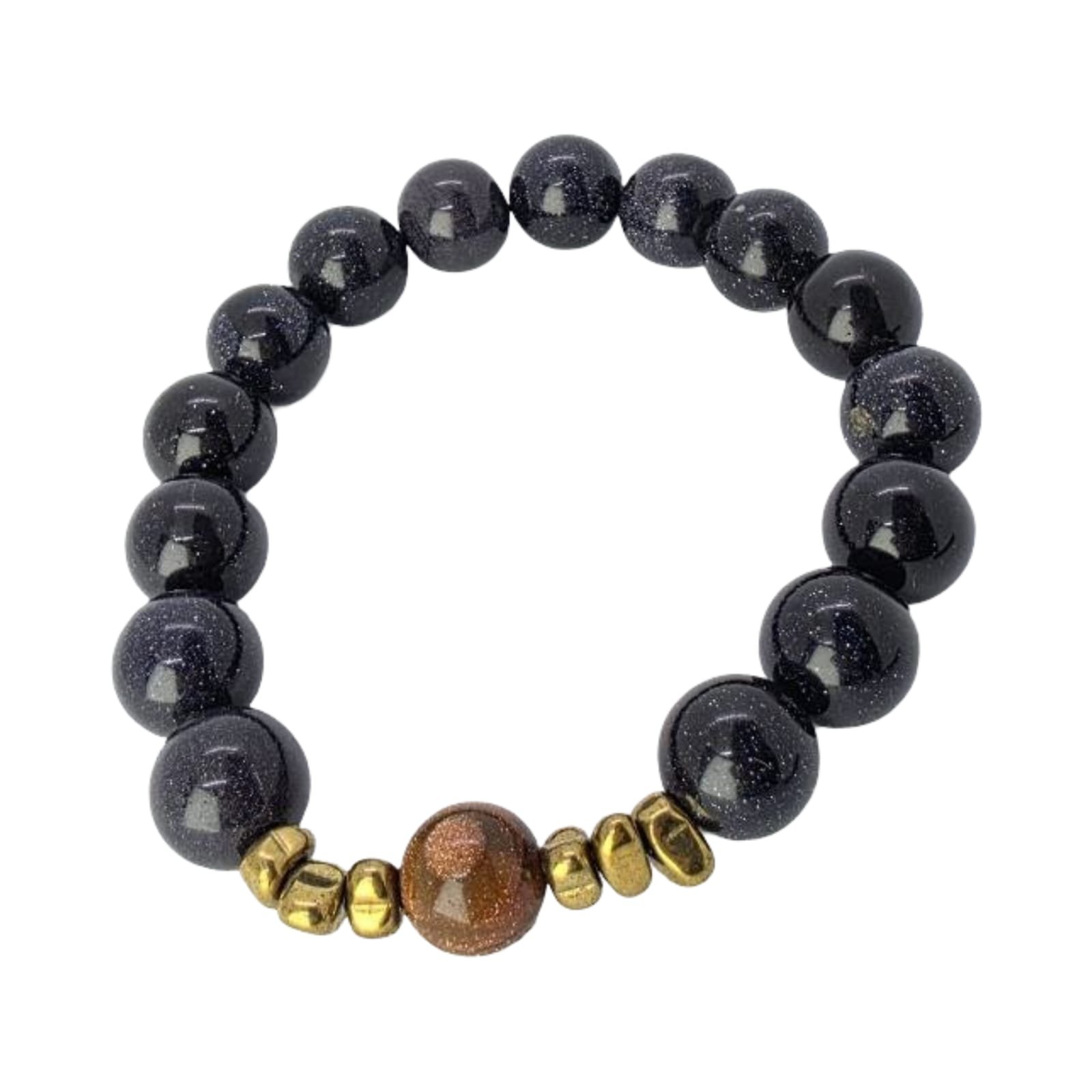 A bold 12mm Navy Star Jasper bracelet accented with Golden Hematite and a 10mm Brown Star Jasper centerpiece. A powerful, celestial design with a luxurious metallic finish.