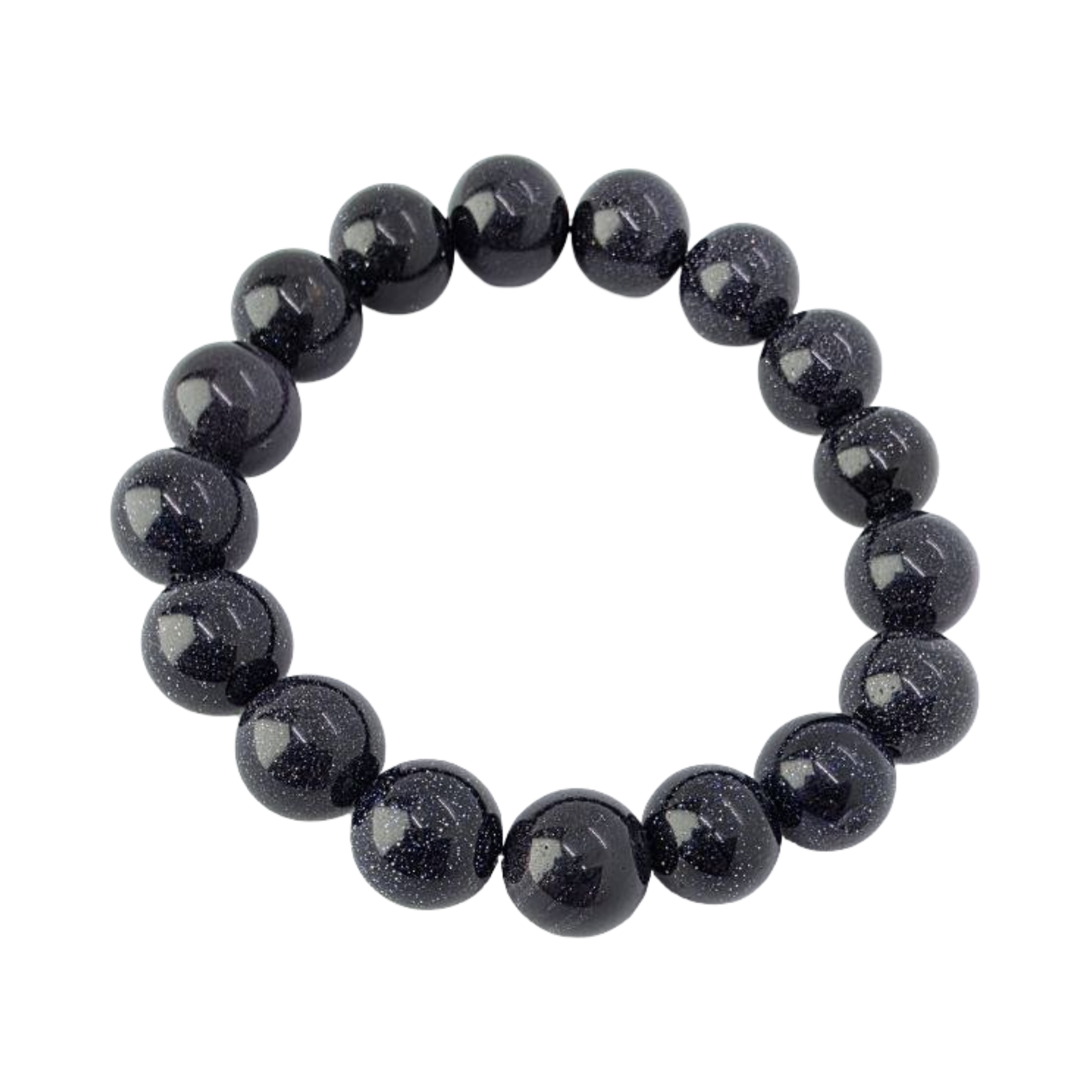 A bold 12mm Blue Goldstone bracelet featuring an intense starry sparkle. Designed with a high-durability elastic fit. A captivating piece that mirrors the beauty of the midnight sky.