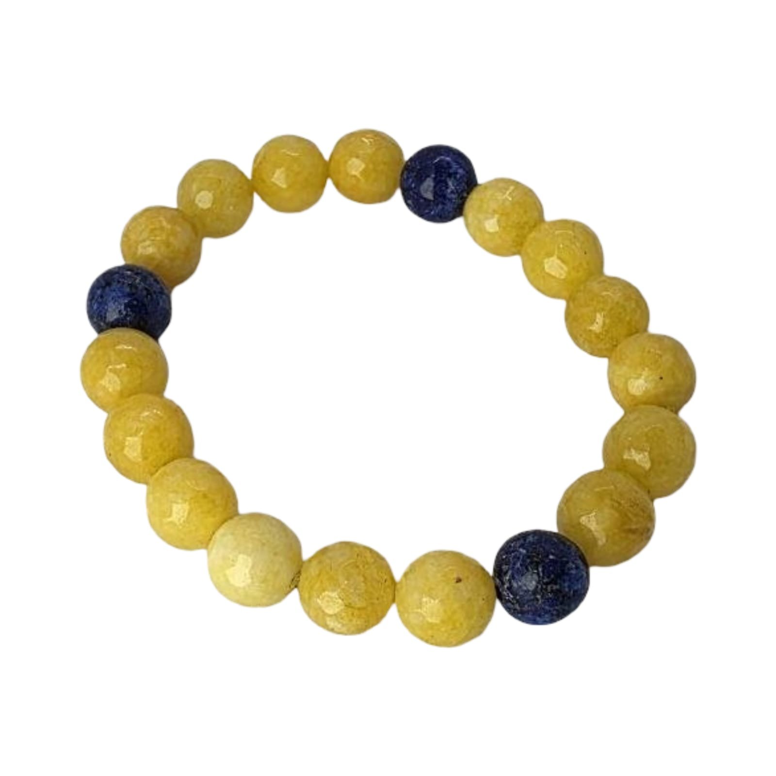 A striking 10mm bracelet featuring faceted Yellow Agate (Sharaf al-Shams) contrasted with deep blue Lapis Lazuli spacers. A vibrant, high-energy design that balances light and depth.