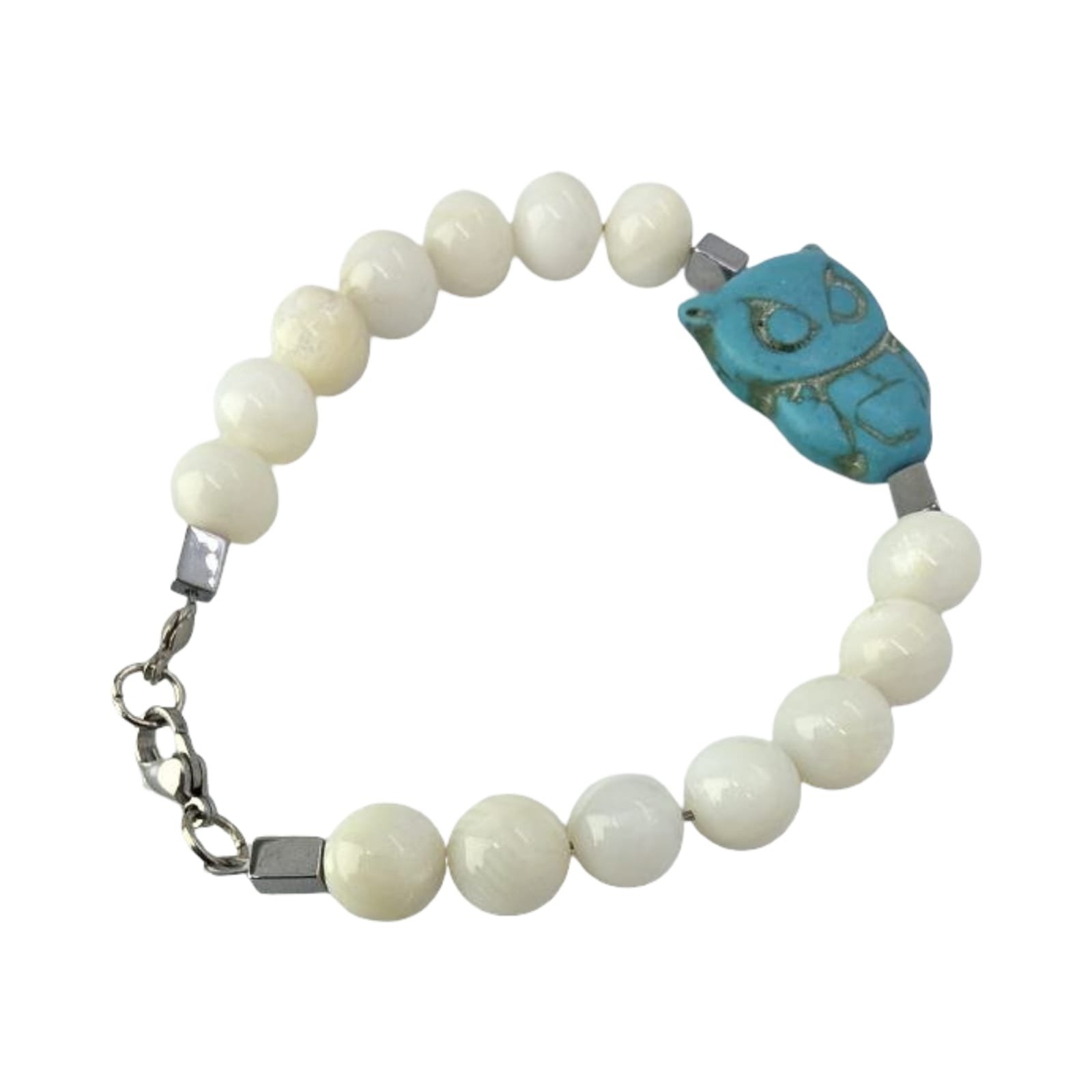 An artistic 10mm Natural Shell bracelet featuring a uniquely carved 16mm Howlite Owl centerpiece. Finished with a premium 925 Sterling Silver clasp. A symbol of wisdom, purity, and timeless style.